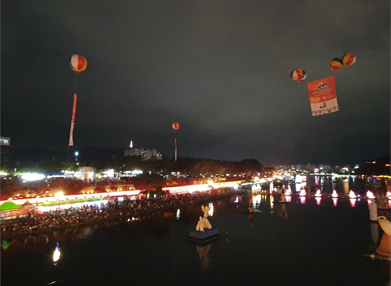 어둠이 내린 남강 하늘엔 축하 에드벌룬이 떠 있고, 부교(임시 다리)에는 청사초롱 불빛이 들어와 있다. 남강에 설치된 유등들엔 아직 불이 켜지지 않았다. 유등 불은 불꽃을 쏘아올리면서 들어온다.