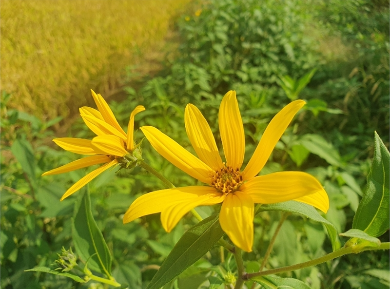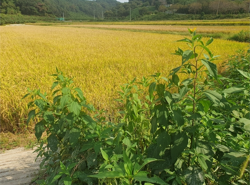 누렇게 익은 벼논 옆 길섶에서 잡초처럼 우거져 있는 돼지감자