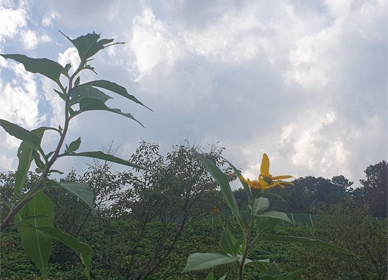 먹구름 하늘 아래 돼지감자 줄기와 꽃이 또다른 구도를 보이고 있다.