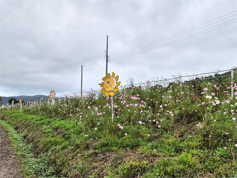 들녘의 길 언덕에도 코스모스가 피어 있다. 중간중간에 해바라기꽃 조형물이 자리해 가을 정취를 더한다.