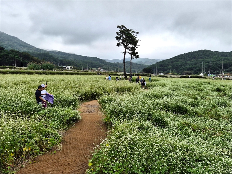 드넓은 메밀꽃밭 속으로 난 오솔길을 걸으며 메밀꽃을 구경하는 모습들