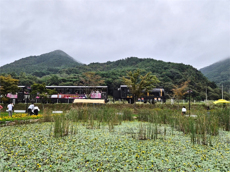축제장 근처에 있는 연못. 부레옥잠과 수초 등 수중식물이 무성하다. 여름엔 연꽃(수연)도 피었을 것으로 짐작된다. 저 멀리 옛 '먹통 기차'는 폐선된 경전선 레이크바일을 끈다.
