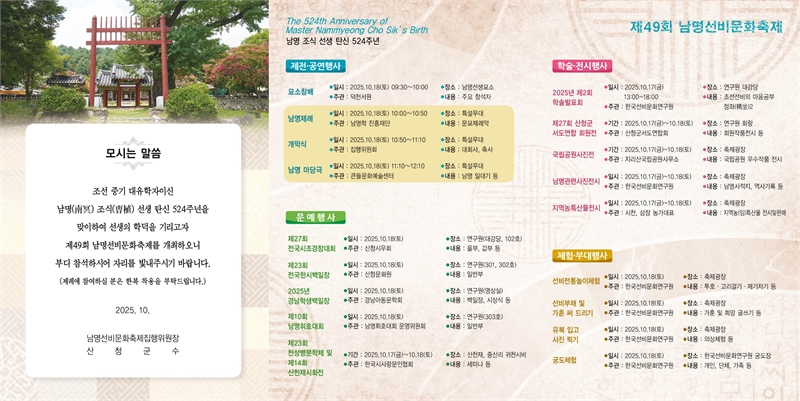 이 외에도 제27회 산청군서도연합회원전과 남명 관련 사진전시, 지리산국립공원 사진전을 통해 선비 문화와 자연의 아름다움을 동시에 전한다.