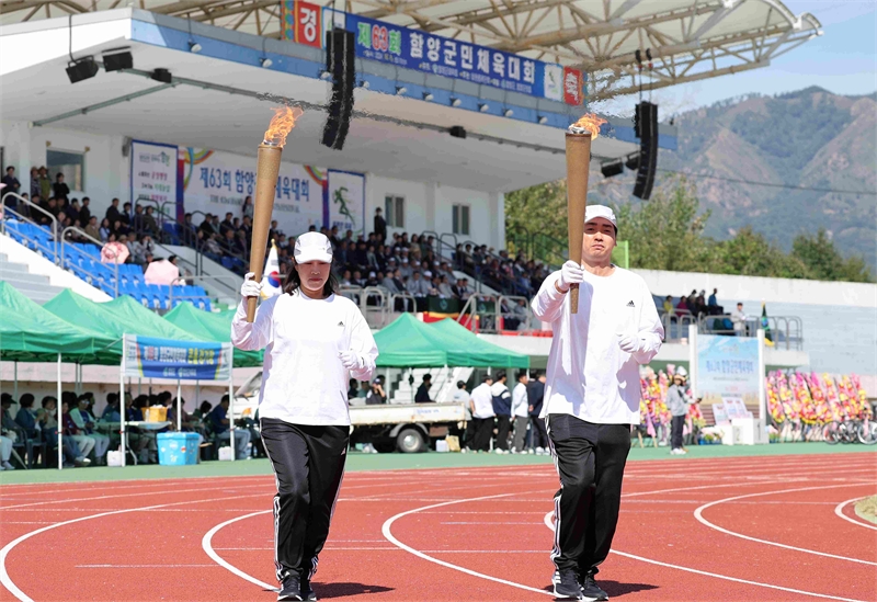 지난 63회 함양군민체육대회 성화 봉송 주자들이 천령봉에서 채화된 성화를 들고 체육대회 개막식이 열린 공설운동장 트랙을 돌고 있다. 성화는 군청 앞 광장에 안치된다. 이상 함양군