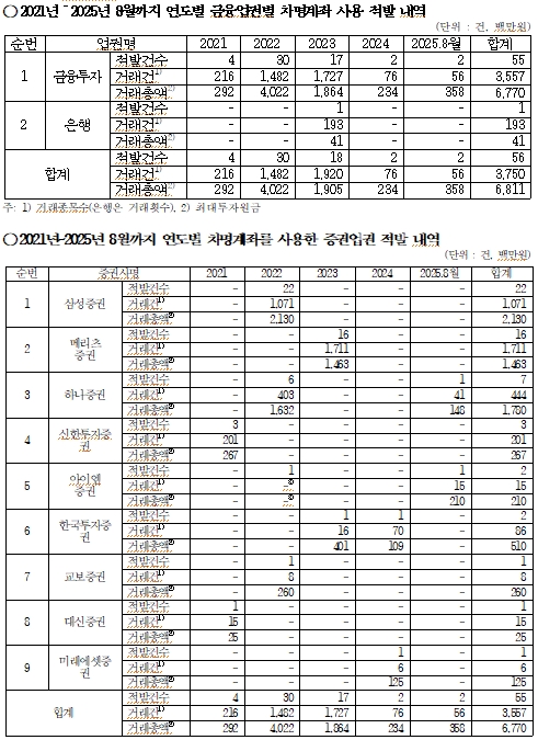 차명계좌 사용 적발이 가장 많은 업권은 금융투자업권으로 55건(98.2%)이었다. 거래 종목수는 3557건(94.9%), 투자원금은 67억 7000만 원(99.4%)이었다.
