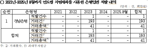 은행업권의 차명계좌 사용 적발은 1건(1.8%)으로 2023년 경남은행 직원의 불법 차명거래 등으로 제재 건이다. 이 직원은 193건(5.1%) 거래에 투자원금은 4100만 원(0.6%)이었다.