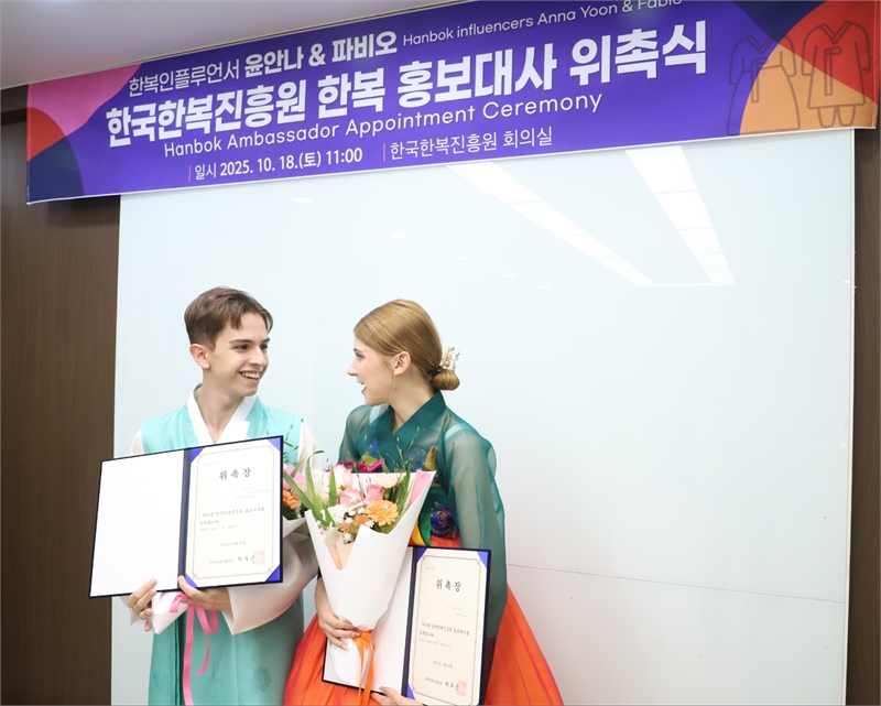 경북 상주시 함창읍에 있는 한국한복진흥원(원장 박후근)은 지난 18일 외국인 홍보대사로 독일 출신 배우 윤안나(독일명 Anna Rihlmann) 씨와 스페인 출신 크리에이터인 파비오 브라이스(스페인명 Fabio Brais Gonzalez Prieto) 씨를 위촉했다고 22일 밝혔다.