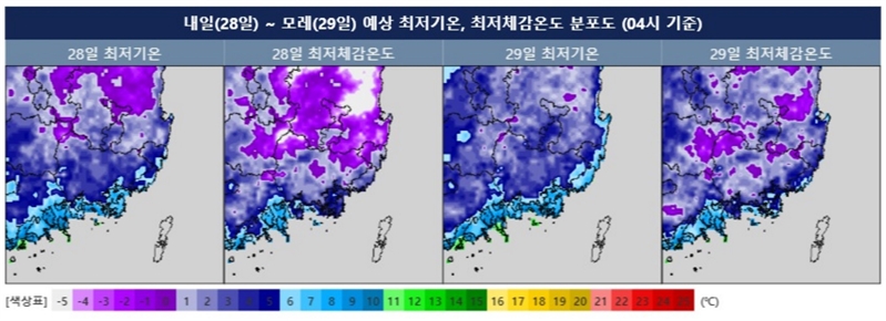 28~29일 예상 최저기온, 최저체감온도 분포도