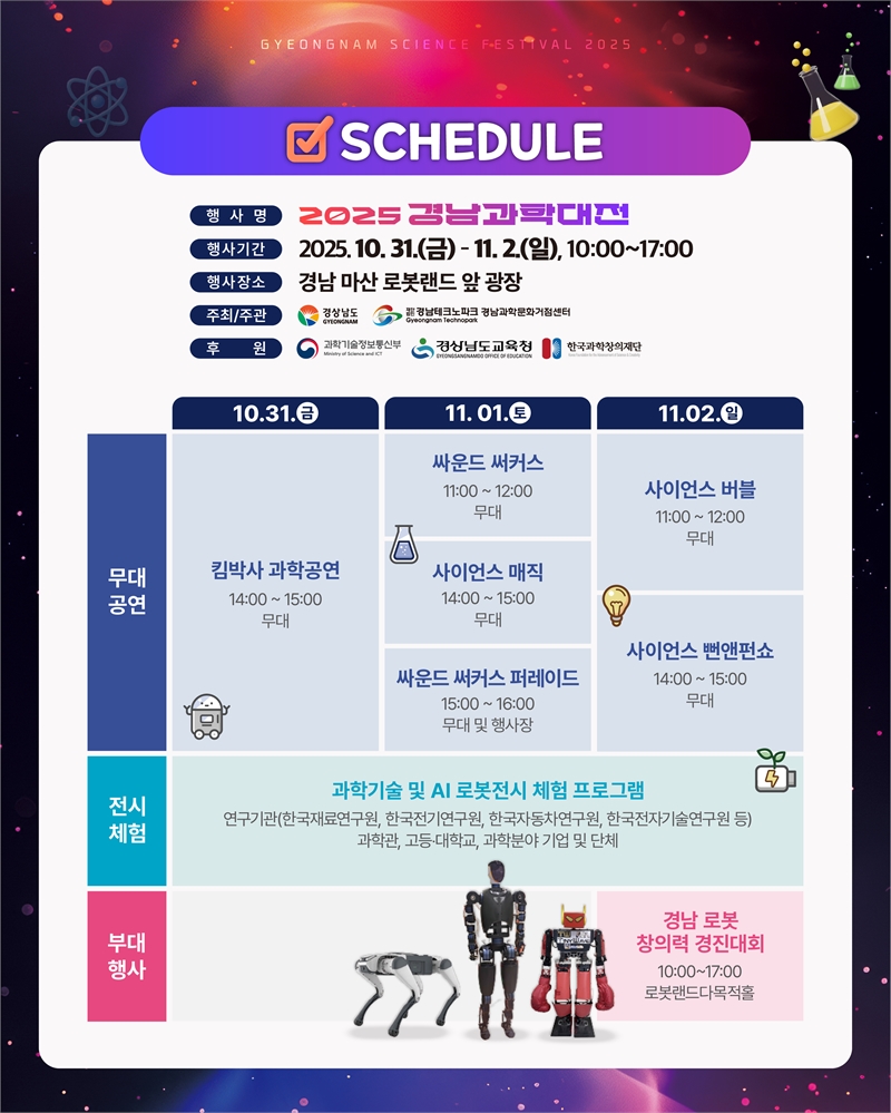 경남도는 경남 최대 규모의 과학축제 2025 경남과학대전이 오는 31일부터 11월 2일까지 3일간 마산 로봇랜드 앞 광장에서 개최된다고 밝혔다.