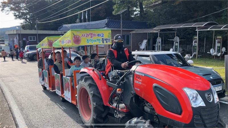 트랙터로 끄는사과열차. 어른, 아이가 함께 타 색다름을 즐기고 있다.