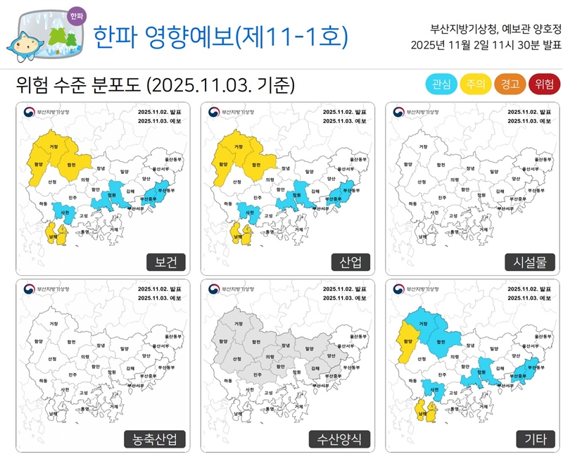○ 한파주의보: 경남서부(함양, 거창, 합천, 남해)