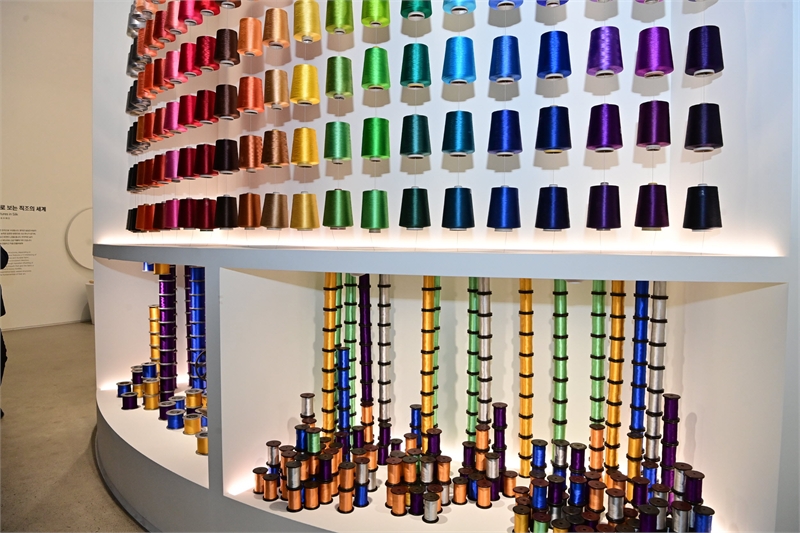 진주 실크로 만든 다양한 색상의 실타래들이 전시돼 있다.