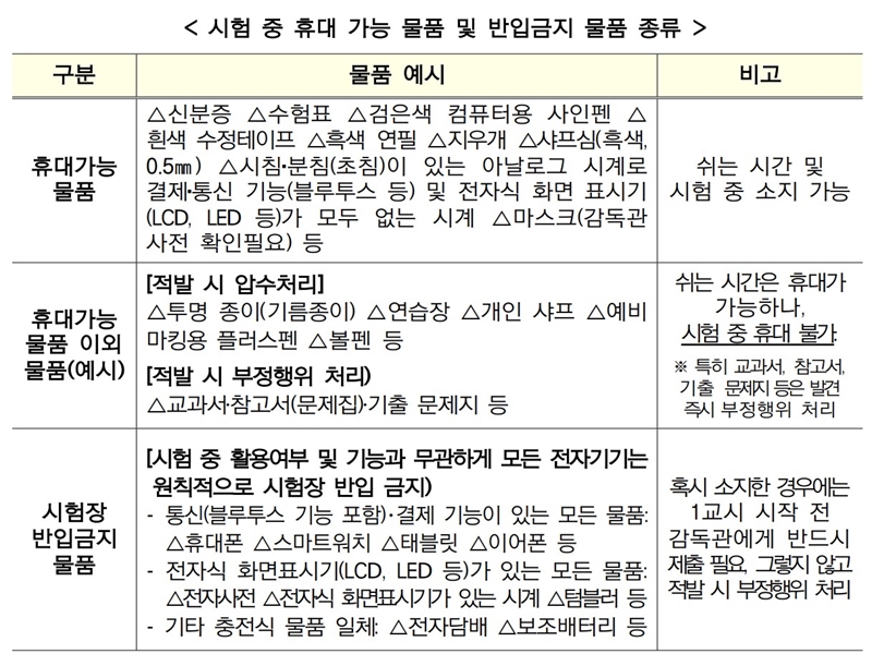 수험생은 시침·분침(초침)이 있는 아날로그 시계만 휴대할 수 있으며, 통신 기능(블루투스 등)이나 전자식 화면표시기(LCD, LED 등)가 있는 시계는 시험장 안에서 가지고 있늘 수 없다. 또 전자담배, 통신 기능이 있는 이어폰 등 전자기기도 소지하면 안된다.