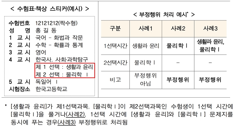 또 4교시 탐구 영역에서 2개 과목 응시를 선택한 수험생이 제2선택 과목 시간에 이미 종료된 제1선택 과목의 답안을 수정하거나 작성하면 부정행위 처리돼 해당 시험이 무효가 된다.