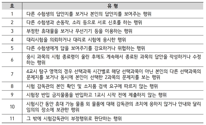 11. 그 밖에 시험감독관이 부정행위로 판단하는 행위