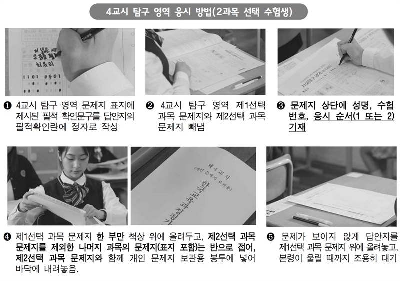 교육부는 일부 수험생이 4교시 탐구 영역 응시 방법을 혼동하고 있다고 보고 특별히 강조해 안내하고 있다.