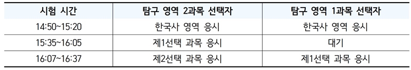 라. 한국사 영역 시험(14:50~15:20) 종료 후 탐구 영역을 선택하지 않은 수험생들은 대기실로 이동하고, 탐구 영역을 선택한 수험생들은 탐구 영역 선택과목 수에 따라 시험을 시작한다.