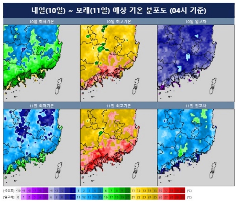 ○ (기온) 기온은 10일 아침까지 평년(최저 2~10℃, 최고 16~19℃)보다 높겠고, 10일 낮과 11일 아침은 평년보다 낮겠으며, 11일 낮 기온은 평년과 비슷하겠습니다.