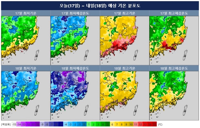 - 17일 낮 최고기온은 부산 12℃, 울산 10℃, 경남 8~13℃로 어제(16일, 19~22℃)보다 7~13℃ 낮겠으며, 평년(13~16℃)보다 2~6℃ 낮겠습니다.