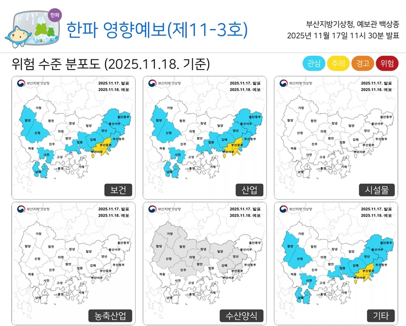 ○ 한파주의보(21시 발효): 부산(부산 중부, 부산 서부)