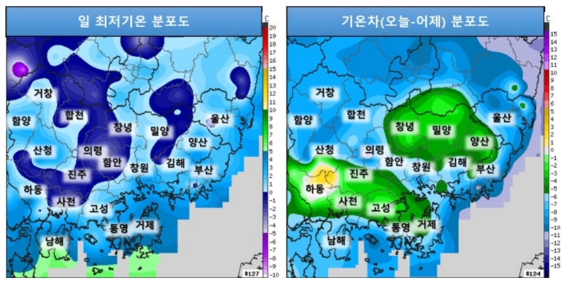 - 부산과 울산, 일부 경남(창원, 통영, 진주, 김해, 의령, 합천, 밀양, 거제)은 올가을 들어 최저기온을 나타낸 곳도 있습니다.