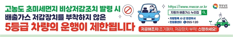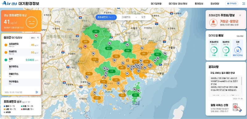 한편 실시간 대기질 정보는 대기환경정보서비스(Air경남·https://golib.gyeongnam.go.kr/main.do)에서 제공하고, 36시간 전 고농도 예보, 문자알림서비스, 미세먼지 신호등 운영과 교통전광판, 라디오, SNS 등으로 홍보하고 있다.