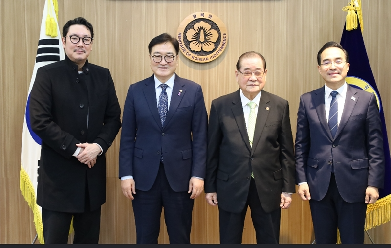 우원식 국회의장이 올해 1월 15일 서울 여의도 광복회관에서 열린 광복 80주년 기념 다큐멘터리 영화 '독립군' 제작 공동기자회견에서 이종찬 광복회장과 기념촬영을 하고 있다. 왼쪽부터 배우 조진웅, 우 의장, 이 회장, 박홍근 민주당 의원. 국회의장실