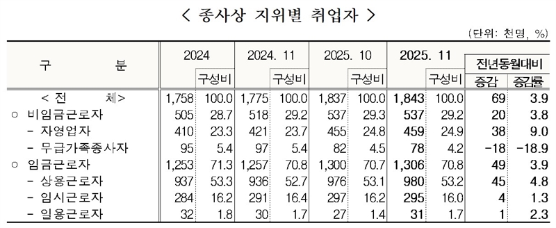 종사자 지위별로 보면 비임금근로자는 전년 동월 대비 2만 명(+3.8%), 임금근로자는 전년 동월 대비 4만 9천 명(+3.9%)이 증가했다. 임금근로자 중 상용근로자는 4만 5천 명(+4.8%), 임시근로자는 4천 명(+1.3%) 늘어났고, 일용근로자는 1천 명(+2.3%) 모두 증가했다.