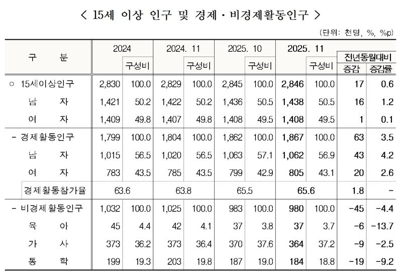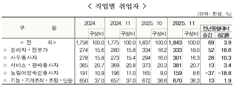 특히 제조업 취업자는 전년 동월 대비 2만 명(+4.8%) 증가해 전반적인 고용 회복을 뒷받침했고, 사업·개인·공공서비스업 취업자 수는 7만 명(+11.6%) 늘었다.