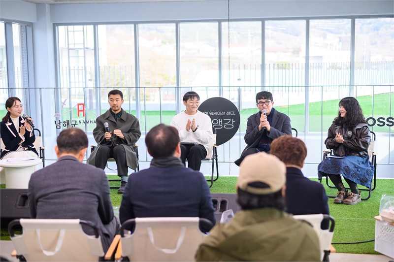 남해군 워케이션센터 앵강 개소식에서 운영사인 비바리퍼블리카(토스) 관계자와 워케이션 민간기업 청년 대표들이 미니 토크쇼 형식으로 개소 소감을 말하고 있다. 이상 남해군