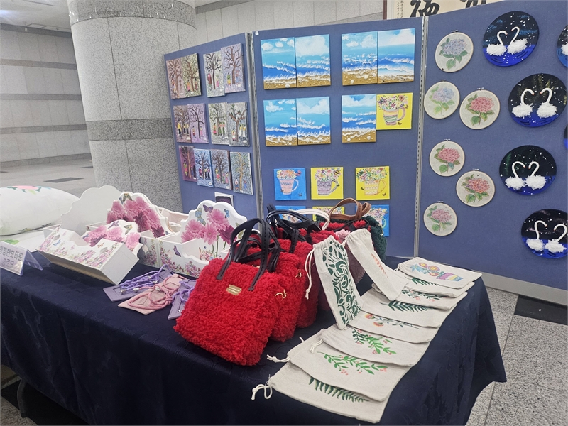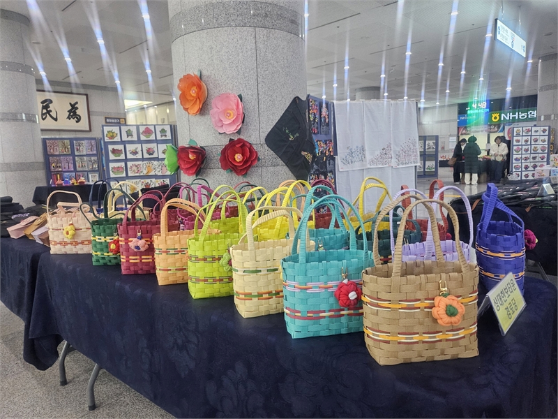 경로당 어르신이 만든 작품들이 진주시 1층 로비에 전시돼 있다.