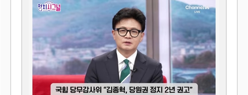 한동훈 국민의힘 전 대표가 지난 12월 18일 채널A에 출연해 친한동훈계 핵심인 김종혁 전 최고위원의 징계와 관련해 말하고 있다. 채널A