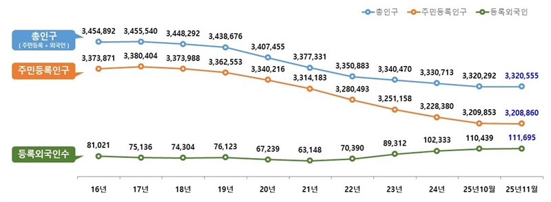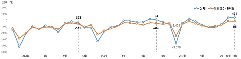 11월 청년(20~39세) 순유출 규모는 161명으로 전년 동월(469명) 대비 308명 감소했으며, 11월 누적 기준 8074명으로 2022년 정점(1만 7644명) 이후 감소세가 이어지고 있다.