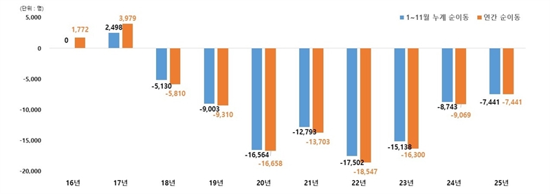 올해 11월 누적 기준 순유출 규모는 7441명으로 7년 만에 가장 낮은 수준을 유지하고 있다. 이는 순유출 규모가 가장 컸던 2022년 1만 7502명과 비교하면 57.5%가 감소한 수치다.