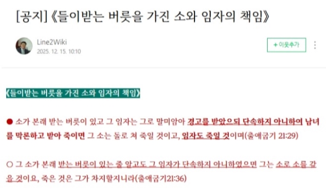 앞서 이 당무감사위원장은 지난 15일 자신의 블로그에 구약성경 '출애굽기' 일부를 인용하면서 "소가 본래 (들이)받는 버릇이 있고, 임자가 그로 말미암아 경고까지 받았음에도 단속하지 않아 사람을 받아 죽인다면, 그 소는 돌로 쳐 죽일 것이고 임자도 죽일 것"이라고 썼다.