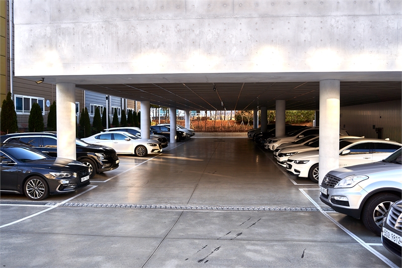 진주실크박물관 주차장. 방문객이 많을 땐 주차 공간이 부족해 도로 쪽에 주차를 해야 한다.