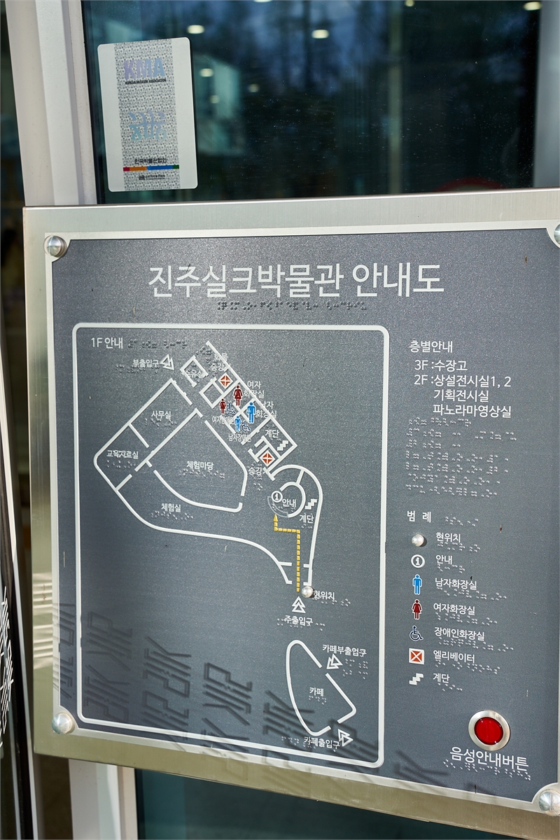 진주실크박물관 안내도. 1층 출입로에 있으며 장애인을 위해 점자와 함께 음성 안내도 한다.