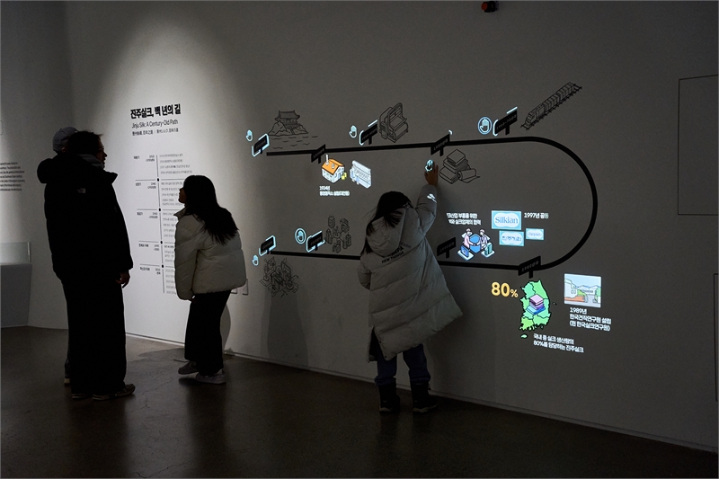 관람객이 전시실에 들러 전시품들을 유심히 살펴보고 있다. 한 가족 관람객이 비단실을 뽑는 기계 등이 전시된 곳을 지나고 있다.