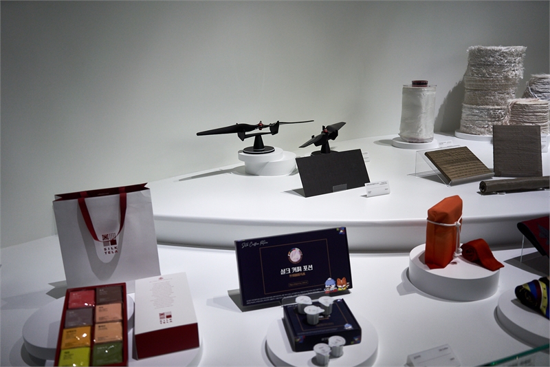 진주 실크로 생산되고 있는 다양한 상품들. 실크에서 아미노산과 단백질을 추출해 만든 화장품과 음식(빵, 커피) 등 다양한 제품을 관람할 수 있다.