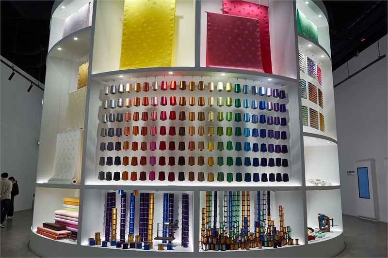 다양한 실크 색상으로 구성한 아카이빙 타워. 실타래 등 실크 관련 물건들이 전시되어 있다.