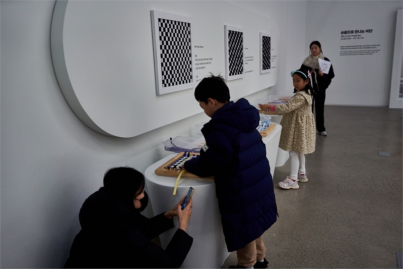 실크의 직조(베짜기) 방식 체험 공간에서 어린이들이 기계들을 사용해 보고 있다.