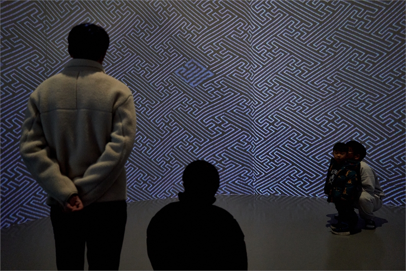 관람객들이 영상실에서 실크 디자인을 바라보고 있다.