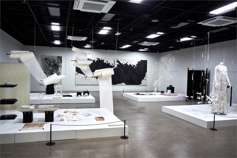 전시된 실크 아트 작품들. 이진희 한국예술종합학교 무대미술과 교수의 작품이다.