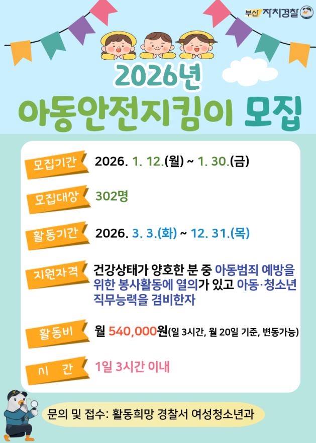 부산시 자치경찰위원회는 9일 부산경찰청과 함께 '아동안전지킴이'를 모집한다고 밝혔다. 모집 기간은 12~30일이며 총 302명을 선발한다.