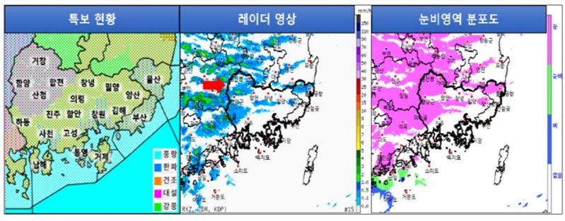 ○ (현황) 일부 경남(산청, 함양, 거창, 합천)에 대설주의보가 발효된 가운데, 기압골의 영향으로 눈구름대가 유입되면서 경남서부내륙(거창, 함양, 합천, 산청, 하동 등)에 눈이 내리는 곳이 있습니다.