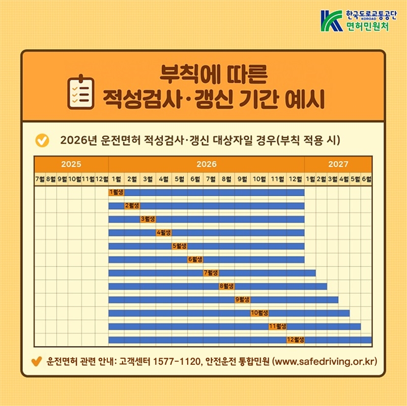 한국도로교통공단 관계자는 “이번 제도 개편으로 연말에 집중되던 운전면허 갱신을 연중으로 분산시켜, 국민에게 신속하고 쾌적한 면허 행정 서비스를 제공할 수 있을 것”이라고 밝혔다.