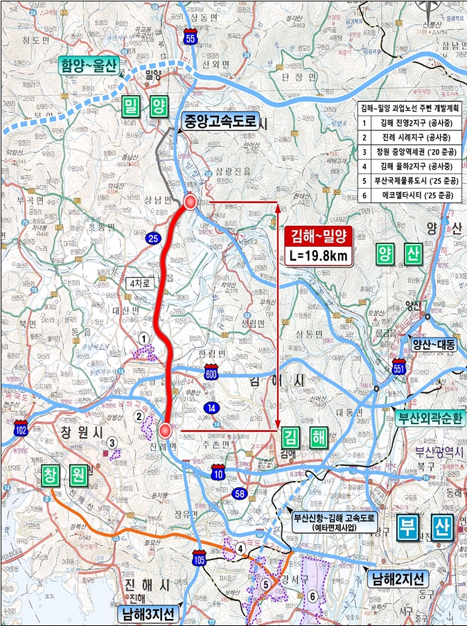 경남도는 31일 기획재정부 10차 재정사업평가위원회에서 ‘김해~밀양 고속도로 건설사업’이 예비타당성조사를 최종 통과했다고 밝혔다.‘김해~밀양 고속도로’는 김해 진례면(진례분기점)에서 밀양 상남면(남밀양 나들목)을 연결하는 노선으로 나들목(IC) 2개소와 분기점(JCT) 3개소를 포함한다. 총연장 약 19.8km, 총사업비