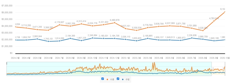 경남도는 올해 10월 수출 누적액이 406억 불로 전년 동월 누계액 대비 7.8% 증가했고, 무역수지 누계액은 206억 4백만 불로 37개월 흑자 기록을 유지했다고 밝혔다.한국무역협회에서 지난 17일 발표한 경남의 10월 수출입 동향에 따르면 ▲수출 61억 4백만 불(51.7%) ▲수입 19억 7천만 불(-12.4%) ▲