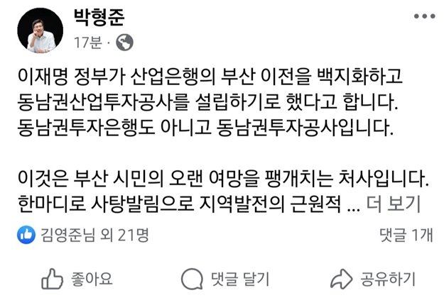 박형준 부산시장은 16일 KDB산업은행 부산 이전 백지화와 동남권산업투자공사 설립에 대한 입장을 밝혔다. 다음은 박형준 부산시장, 산업은행 부산 이전 백지화와 동남권산업투자공사 설립에 대한 입장이다. “부산시민은 날림 부실 금융기관 동남권투자공사 설립이 아닌 산업은행 부산 이전을 원합니다!” 이재명 정부가 산업은행의