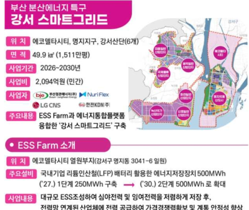 부산시가 전국 처음으로 분산에너지 특화지역(분산특구)로 최종 확정됐다. 부산 분산특구의 핵심사업은 ESS Farm과 에너지 통합플랫폼을 융합한 ‘강서 스마트그리드 구축’이다.이로써 부산은 대규모 에너지저장장치(ESS) 설치와 함께 인공지능(AI) 기반 에너지 관리 효율화로 에너지신산업 거점으로 도약할 전망이다. 분산특구란